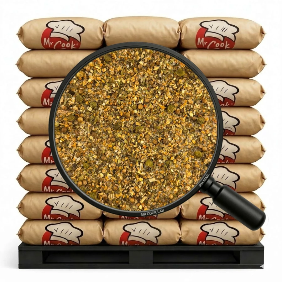 sól, pieprz czarny, wzmacniacz smaku: glutaminian monosodowy; pieprz zielony, cebula, czosnek granulowany, cukier, kolendra, papryka słodka, majeranek, tymianek, pieprz czarny, skoncentrowany sok z buraka (60% maltodekstryna, 40% skoncentrowany sok z buraka); chilli.