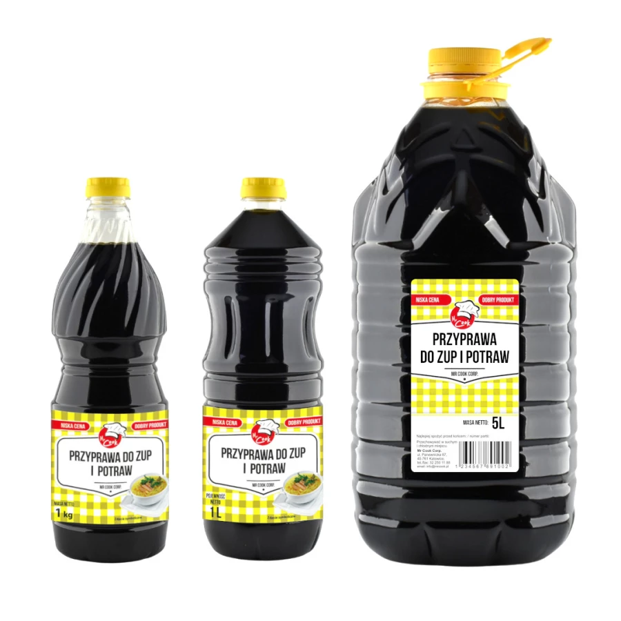 woda, sól, hydrolizat białka sojowego, ocet, cukier, barwnik: karmel E 150c; wzmacniacze smaku: glutamina monosodowy, 5`-rybonukleotydy disodowe; aromaty (z selerem).