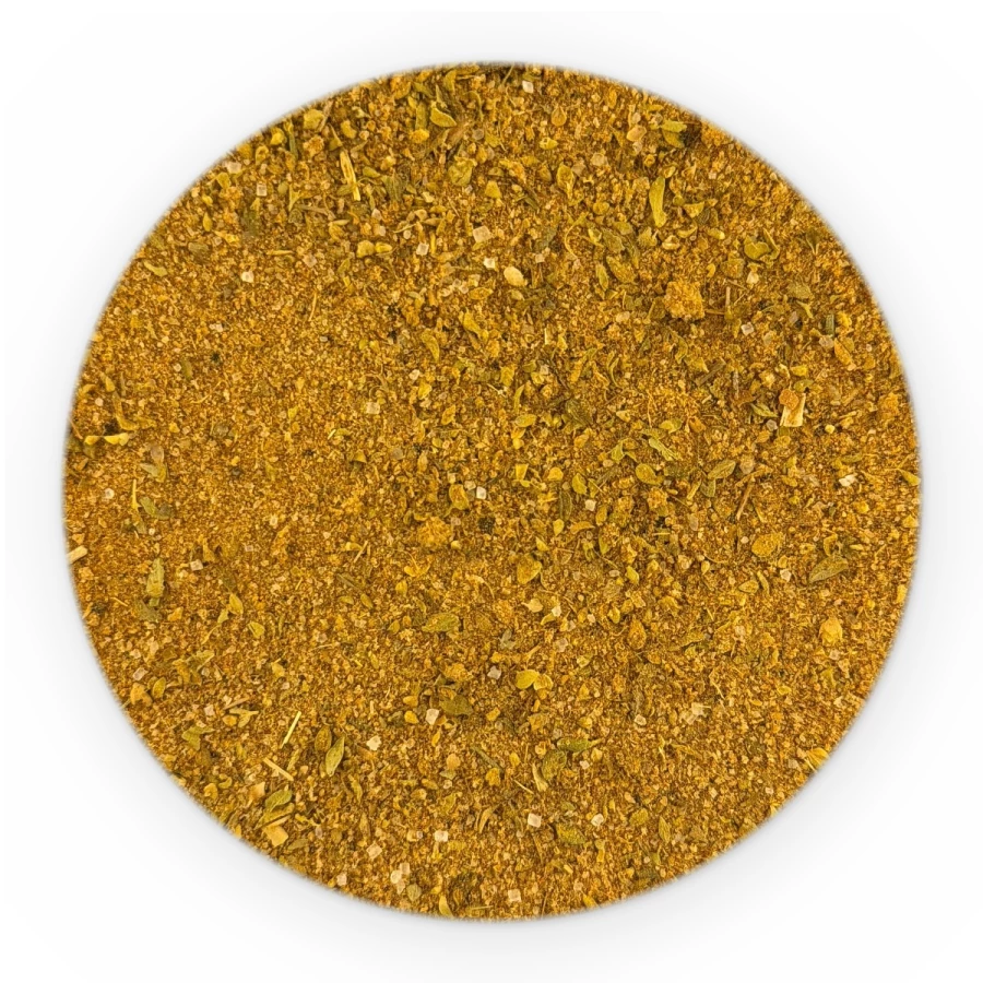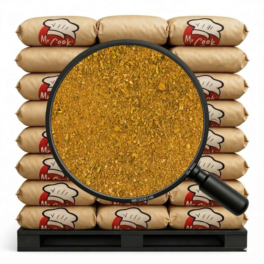 sól, wzmacniacze smaku: glutaminian monosodowy; 5`-rybonukleotydy disodowe; papryka słodka, cukier, czosnek, curry (kolendra, kurkuma, kozieradka, gorczyca, goździki, koper włoski, imbir, czosnek, cynamon, pieprz czarny, suche mango, kukurydza); imbir, rozmaryn, kardamon, kolendra, pieprz Cayenne, kurkuma, koncentrat pieprzu czarnego (mąka sojowa, sól, wzmacniacz smaku: glutaminian monosodowy; ekstrakt pieprzu czarnego); koncentrat czosnku ( mąka sojowa, sól, wzmacniacz smaku: glutaminian monosodowy, ekstrakt pieprzu czarnego).