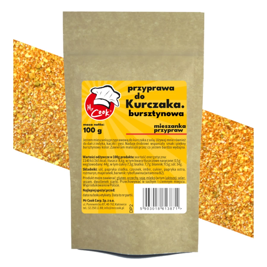 sól, papryka słodka, czosnek, imbir, cukier, papryka ostra, rozmaryn, majeranek, barwnik: ryboflawina (witamina B2).